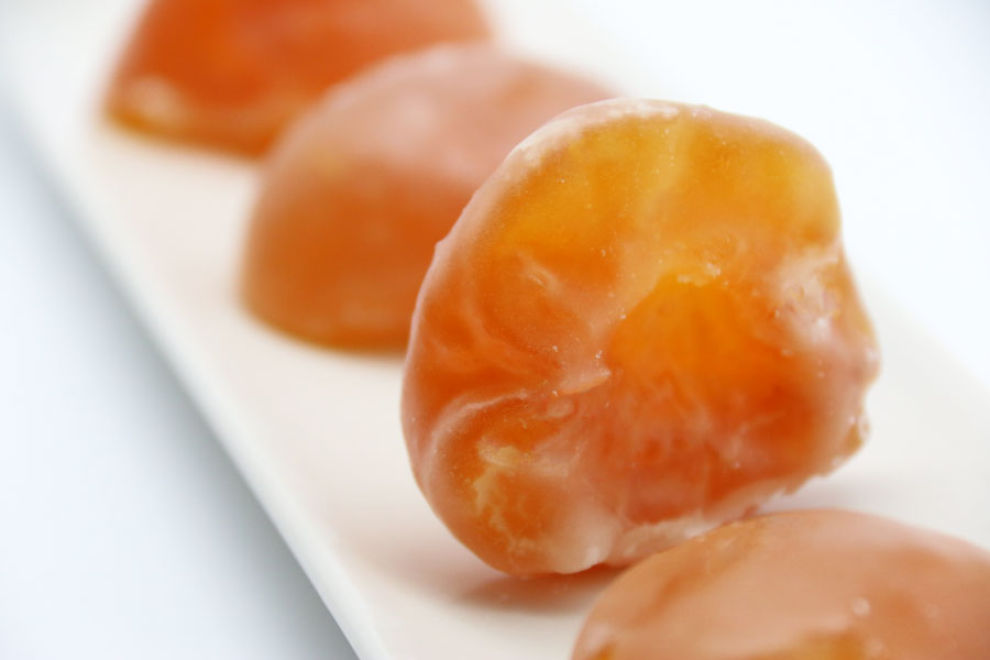 Melocotón glaseado, cocido con almíbar hasta conseguir un grado brix de 73-75º y una textura y sabor característico